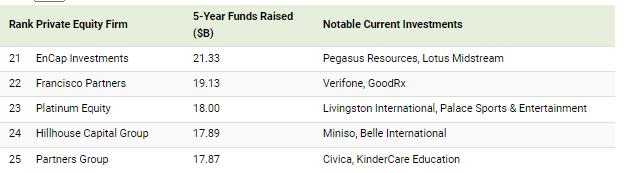 다음은 지난 5년간 PE 모금 총계를 기준으로 가장 큰 25개 사모 주식회사로,