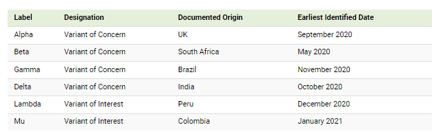 2021년 9월 현재 WHO는 잠재적 심각도에 따라 서로 다른 분류를 가진 전 세계 20개의 COVID-19 변종을 추적하고 있습니다.