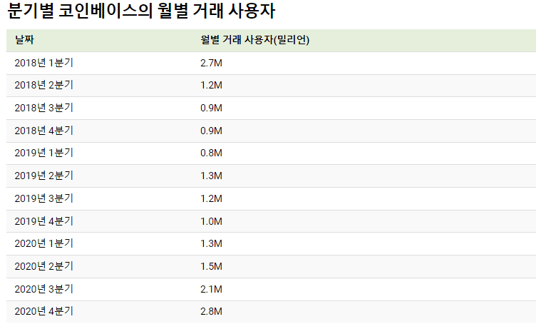 분기별 코인베이스의 월별 거래 사용자
