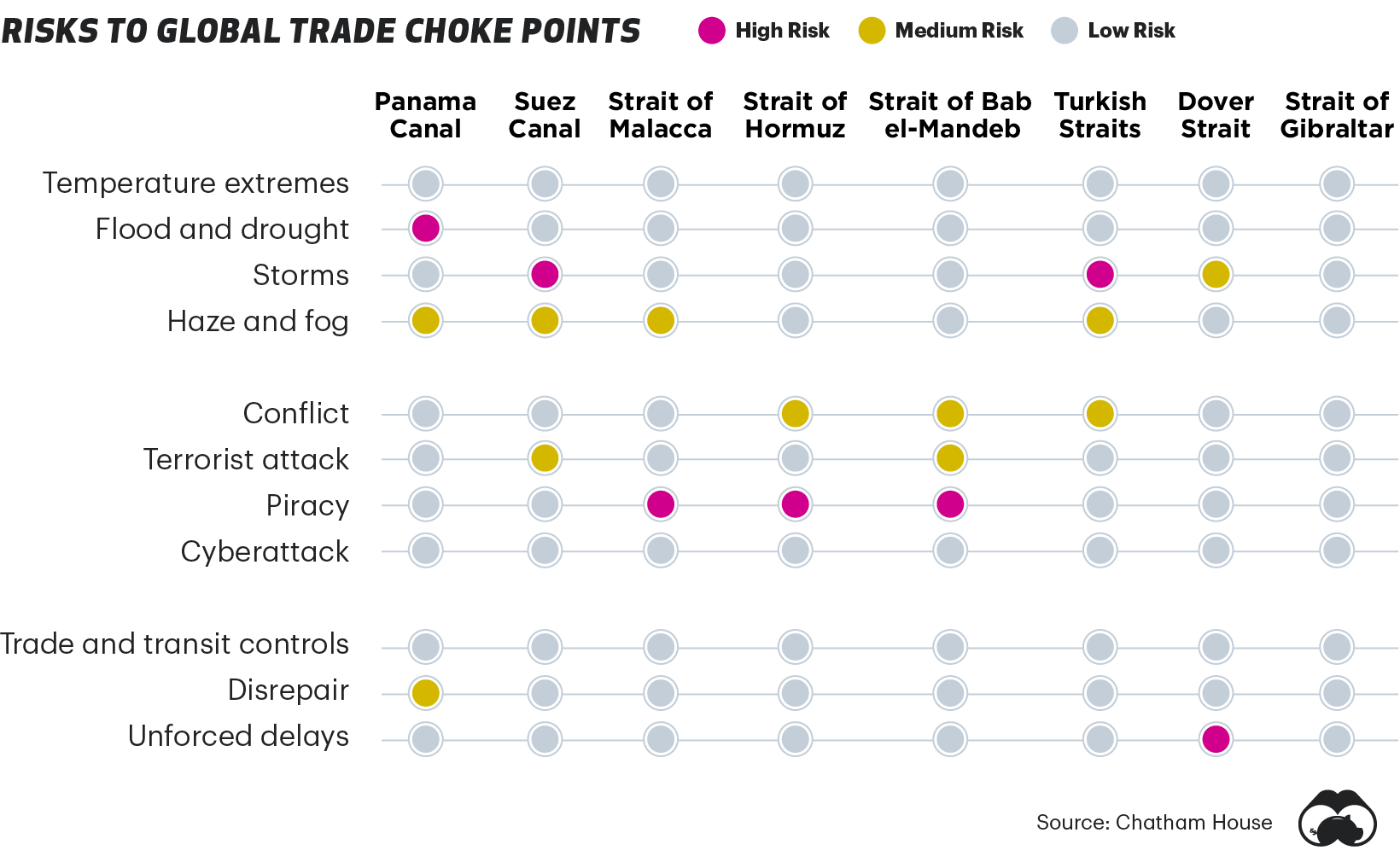 위험의 종류와 정도는 위치에 따라 다르다.여기 세계 주요 초크 지점 중 8곳에서 가장 큰 위협 요소를 살펴봅시다.