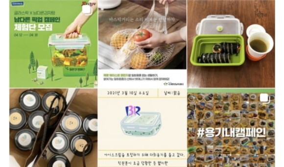 물건을 구입할. 때 따라오는 플라스틱 용기 , 일회용 비닐 봉지 쓰레기 발생을 줄이기 위해서 개인이 직접 용기를 가게에 들고 가는 운동 실천